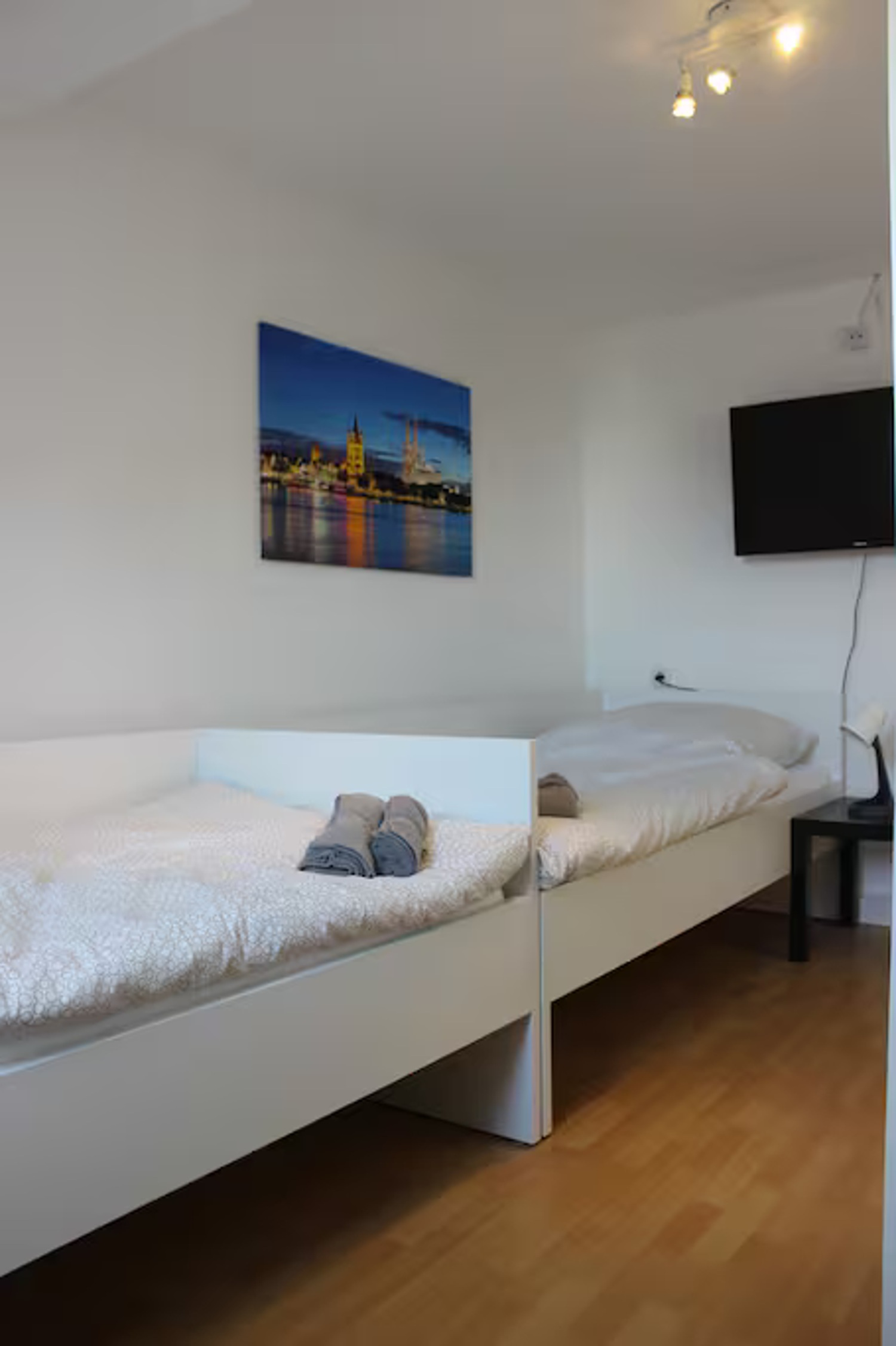 - Living room/bedroom 1: 2 single beds, bed linens provided