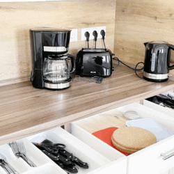 - Kitchen and household items: Fully equipped kitchen with coffee maker, dishes, dishwasher, freezer, kettle, microwave, oven, refrigerator, and a four-zone stove. A toaster is also available.